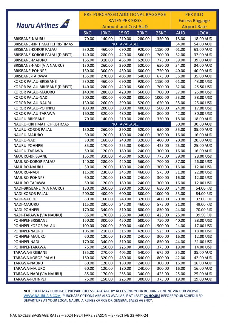Planning to pack a little extra? Save more by pre-purchasing additional baggage allowance online at nauruair.com, where you'll enjoy lower rates than at the airport.