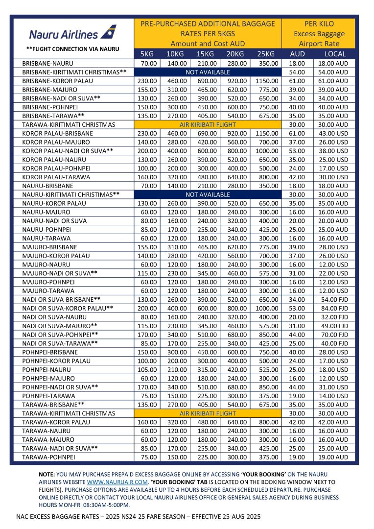 • No Guarantee of Carriage: Nauru Airlines cannot guarantee that additional baggage will be transported. Acceptance is at our sole discretion and subject to aircraft load constraints.